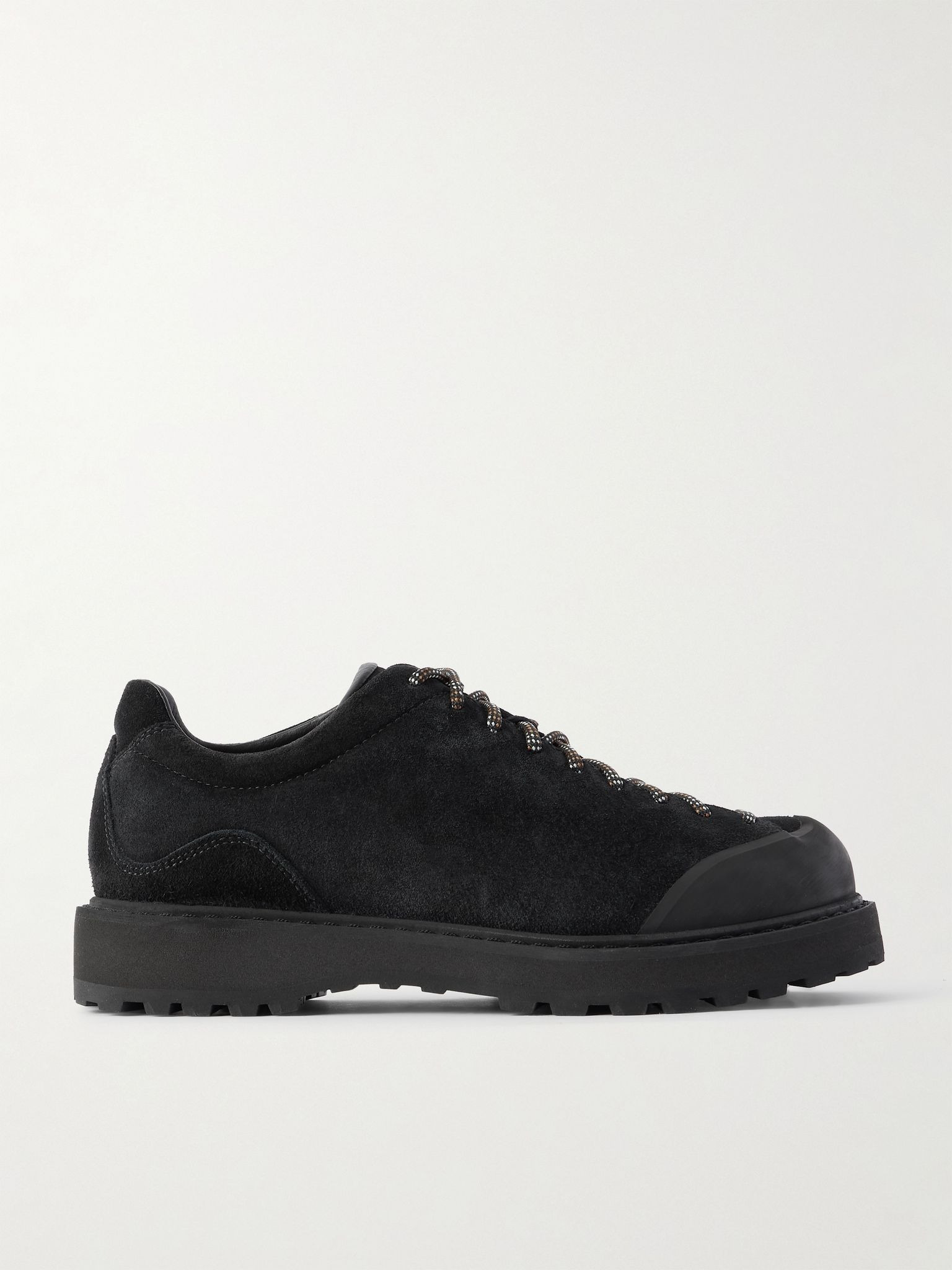 Over the past few years, boot-maker Diemme has solidified its place in the fashion zeitgeist, with fans like Grammy-award winning artist Frank Ocean, and co-hosts of the Throwing Fits podcast, James Harris and Lawrence Schlossman. A mid-point between sneakers and boots, this 'Ampezzo' pair has 'Movida' uppers of 'Nut' suede, with rubber overlays for added durability. They're set on 'Cornaro' outsoles with deep lugs to provide traction on gravel and scree. Details & Care - Black suede (Calf) - Lace-up