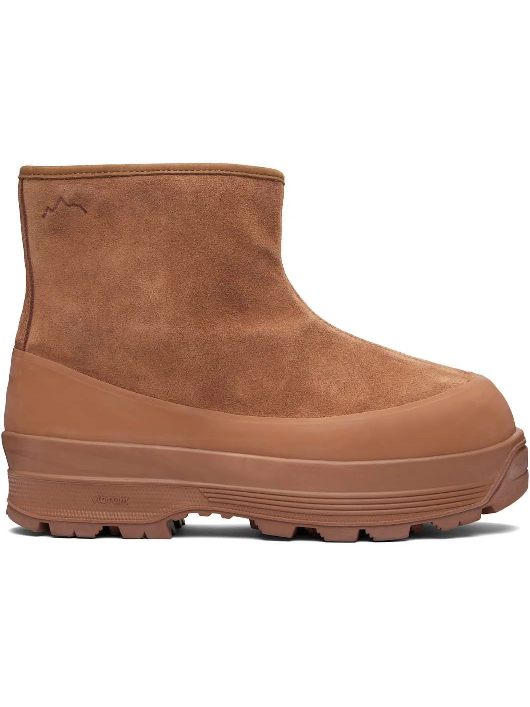 Ankle-high suede boots. · Logo embossed at outer side · Shearling lining · Rubber trim at welt · Treaded Vibram® Sniper Alta rubber sole Supplier color: Cognac suede Upper: leather. Sole: rubber. Made in Italy 261396M223003