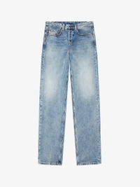 PRODUCT ID: A0515609C66 - 100%Cotton - Straight - Button fly - Non-Stretch - Medium treated - Light blue Model is wearing a size 31 and is 182 cm / 5'10'' Fits true to size, take your normal size. Straight style with button fly. Minimal detailing and a clean construction make this timeless silhouette extremely versatile and easy to wear, suited to any age or era. With lasered whiskers and used effects, this light blue wash channels a vintage look. The treatments are entirely made in Italy, and the pair is crafted from fix fabric with a percentage of recycled fibres.