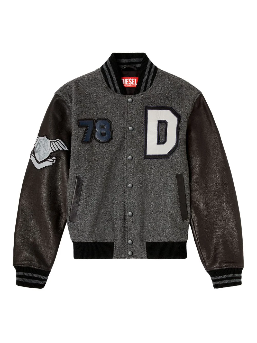 A-Arry-Cp patches-embroideries jacket Highlights - Grey - Leather details - Embroidered patches - Logo-inspired patches on the front, back and on sleeves - Ribbed neck and cuffs - Snap button closure Imported Composition Outer: Leather 100%, Wool 81%, Polyamide 19% Washing instructions Read Manufacturer Guidelines