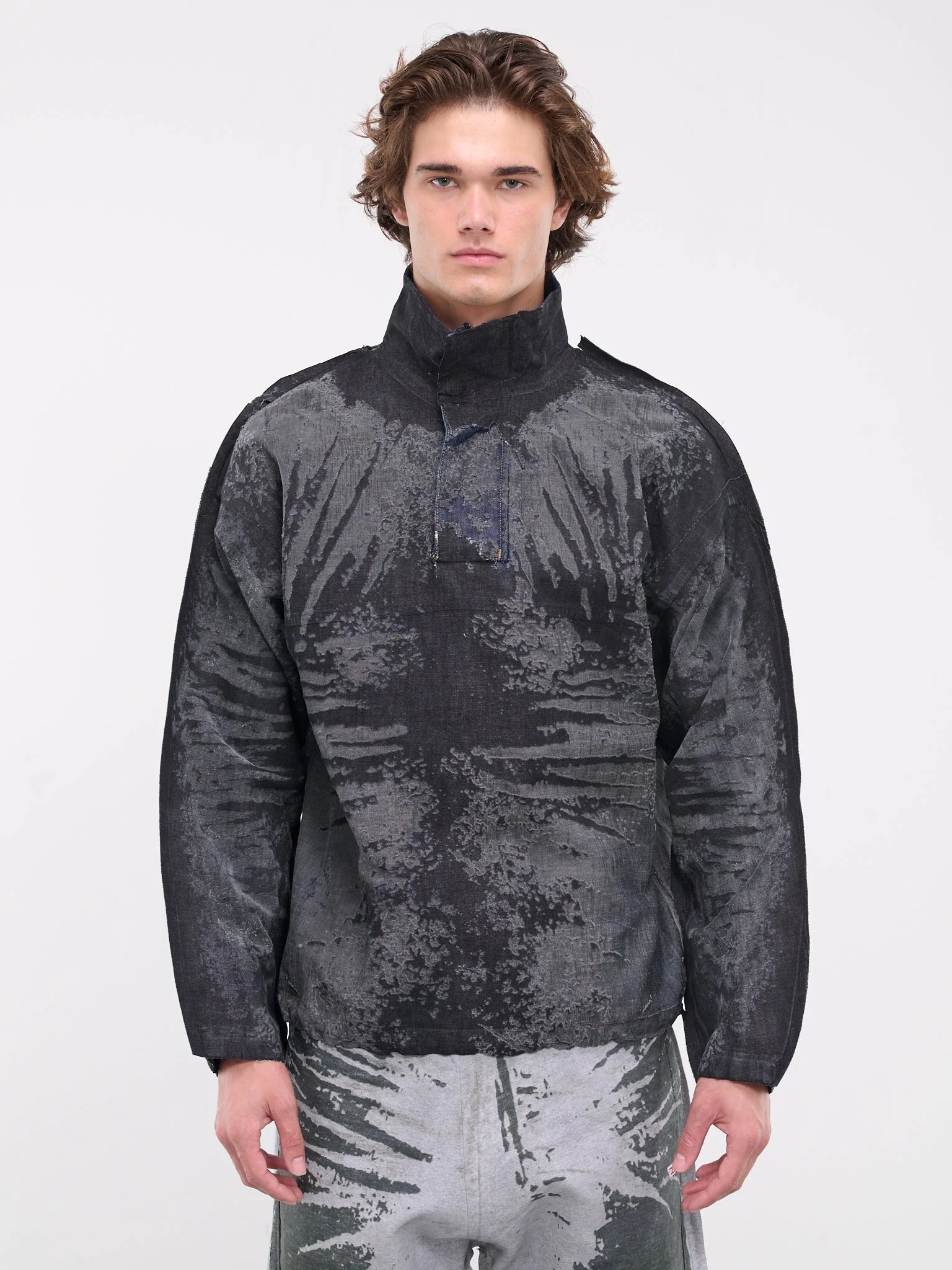 DIESEL jacket in black, paneled denim construction, printed worn effect, stand collar, front concealed quarter-buttoned placket closure, long sleeves, sleeve exposed seams, elasticated cuffs & hem, straight hem, relaxed fit. Outer: 50% Cotton 40% Lyocell 10% Modal Contrast: 100% Polyamide Standard Sizing Model is 6'2" wearing size M. Shoulders: 19" Chest: 38" Waist: 31"