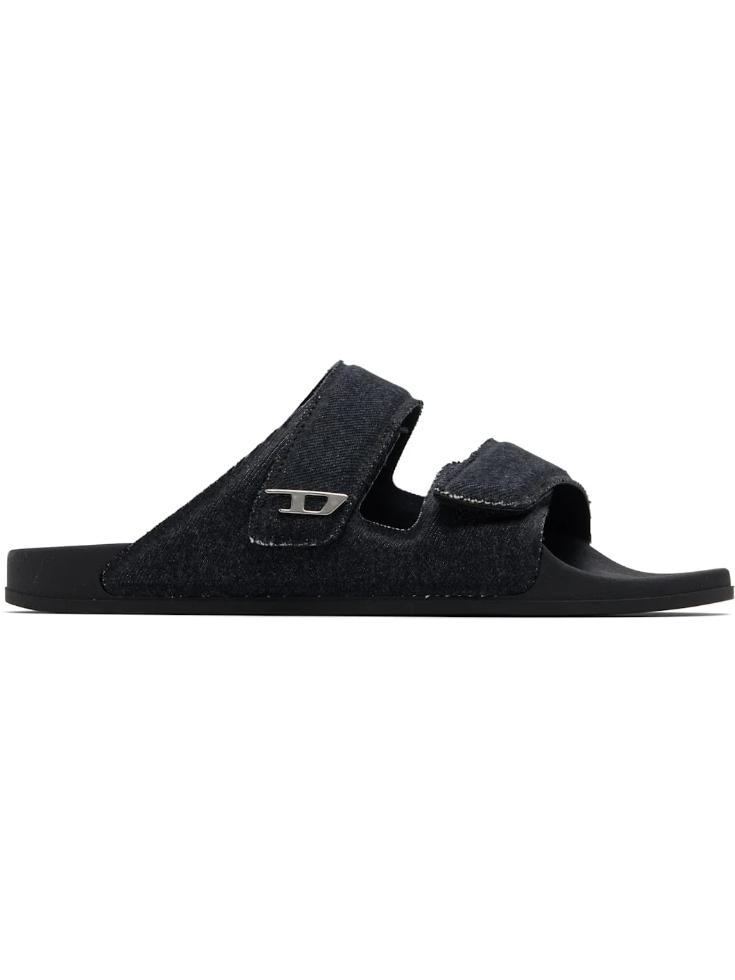 Denim sandals. · Open toe · Velcro straps at vamp · Logo hardware at outer side · Logo embossed at molded footbed · Jersey lining · Treaded rubber sole Supplier color: Black Upper: textile. Sole: rubber. Made in Italy 252001M234000