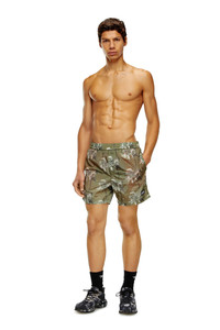 Model is wearing a size L and is 182 cm / 5'10'' Fits true to size, take your normal size. These men's swim shorts have a long-length profile and a muted palm-tree pattern printed all-over. They're cut from lightweight recycled shell with a crinkly texture and finished with a logo patch. The hidden drawstring at the waist ensures an adjustable fit.