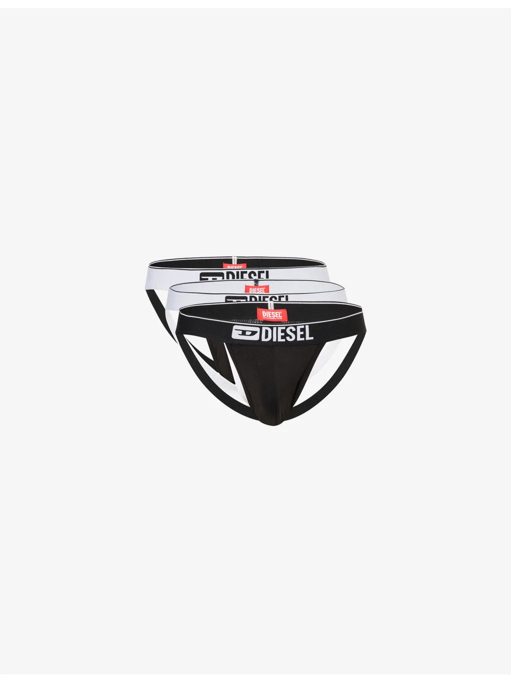 PRODUCT DETAILS - Diesel pack of three stretch-cotton jock strap - 95% cotton, 5% elastane - Mid-rise, branded elasticated waistband, supportive panel at front - Machine wash at 30°C - Model is 6ft 2in/1.88m and wears a size medium - Lightweight, slight stretch - For hygiene reasons, we are unable to exchange or refund this product, unless faulty. Ref: R04493512
