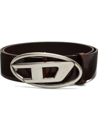 Vegetable-tanned buffed leather belt. · Keeper loop at length · Logo hardware at post-stud fastening · Antiqued silver-tone hardware · W1.75" Supplier color: Brown Leather. Made in Romania 252001M131012