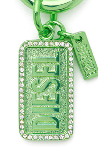 Product Description This charm is designed with a bold rectangular pendant featuring embossed Diesel lettering and embellished along the edges with a row of clear rhinestones. Completed by a circular ring for easy attachment to bags or keys. ID: X10808P9132 Materials & Details Composition: 90%Zinc 10%Iron Metal ring clasp Diesel logo tag