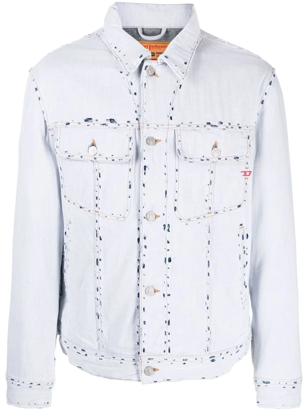D-Barcy ripped denim jacket Highlights - Light blue - Stretch-cotton - Distressed effect - Ripped detailing - Classic collar - Front button fastening - Two button-fastening chest pockets - Two front welt pockets - Long sleeves - Buttoned-cuff sleeves - Straight hem Made in Italy Composition Cotton 98%, Elastane 2% SIZE & FIT Model measurements Height 6 ft 2 in(1.87 m) Bust/Chest 36.22 in(92 cm) Hips 37.79 in(96 cm) Waist 28.34 in(72 cm) FittingInformation Designed for a boxy fit, intended for a loose fit throughout Sturdy and hard-wearing, this denim piece offers no stretch This piece fits true to size – take your usual size Washing instructions Machine Wash