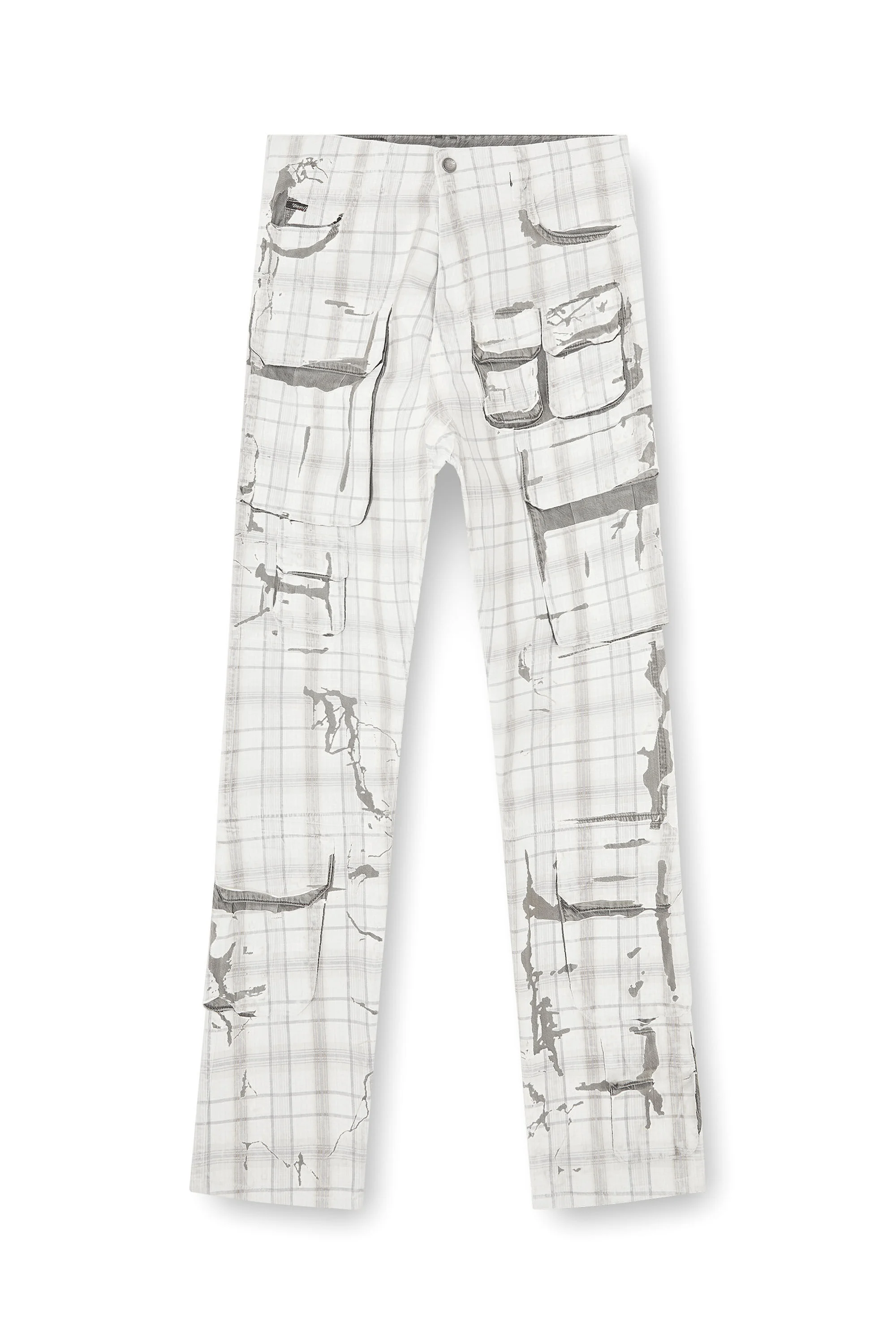 Product Description Slim fit with a medium waist and multiple belt loops – an SS26 Runway show signature detail. This style is characterised by 3D patch pockets in different sizes all-over the front of the leg and in place of the back pockets. Button fly. This conceptual wash features a check-printed jersey overlay fused onto a fluid denim base through a unique process. The stone-washed denim beneath is partially revealed by laser-traced artwork and tactile peel-off effects, symbolically referencing the “animal within you.” Distressed in Italy, this elevated piece blends haute-couture flair with Diesel’s subversive denim experimentation. ID: A23670068WA Size & Fit Model is wearing a size 32 and is 182 cm / 5'10'' Check the size chart to choose the correct size. Materials & Details Composition: 60%Lyocell 40%Cotton, Application 90%Cotton 10%Elastane-Spandex Fit: Slim Waist: Mid Wash: Treated Fabric: Non-Stretch Closure: Button fly