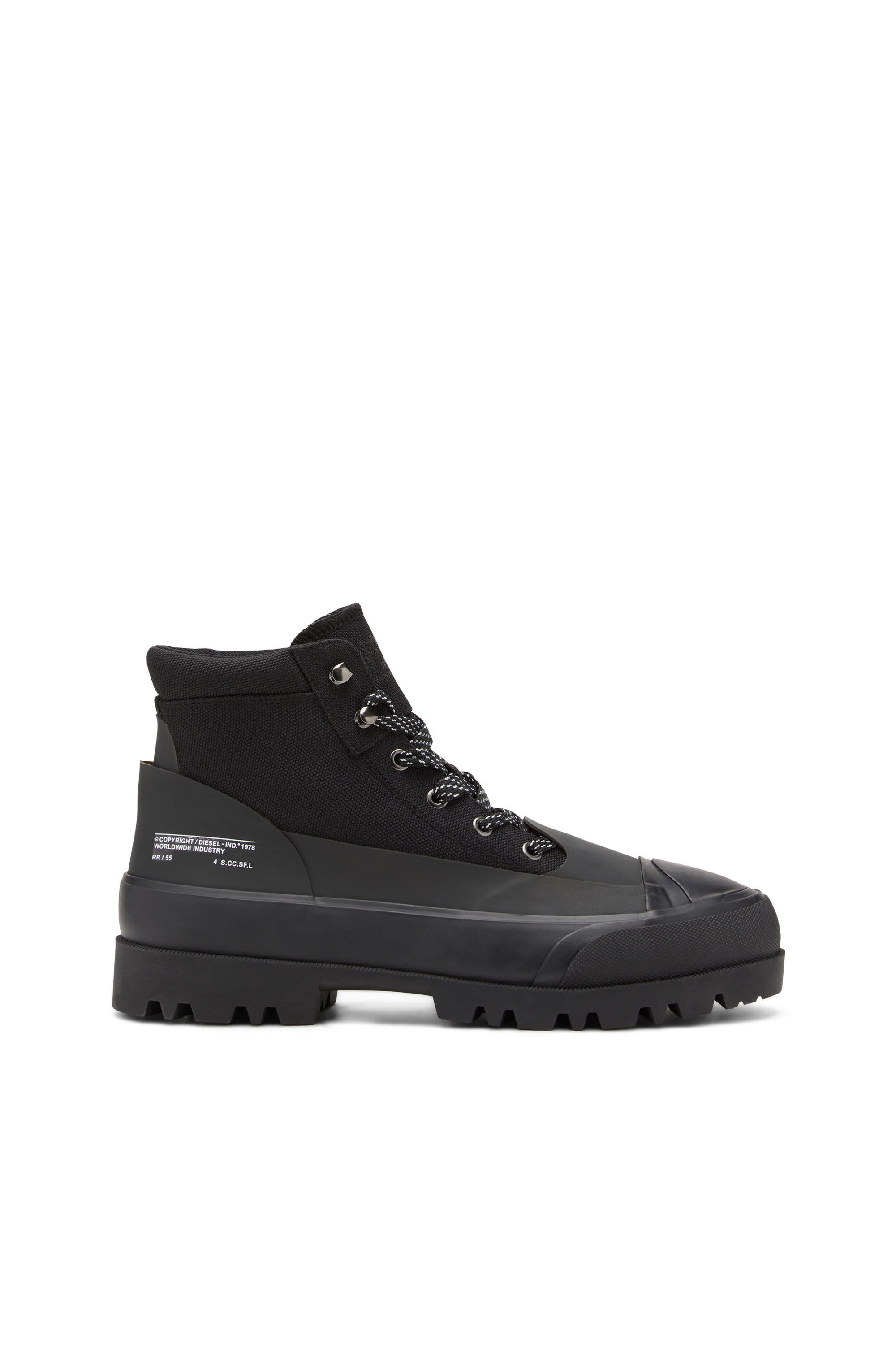 Informed by hiking and military styles, these unisex shoes have heavy-duty ballistic-nylon uppers trimmed with layers of rubber that completely cover the vamp. The combination of rubber foxing and rugged lug sole underpins the hybrid sneaker-boot silhouette.