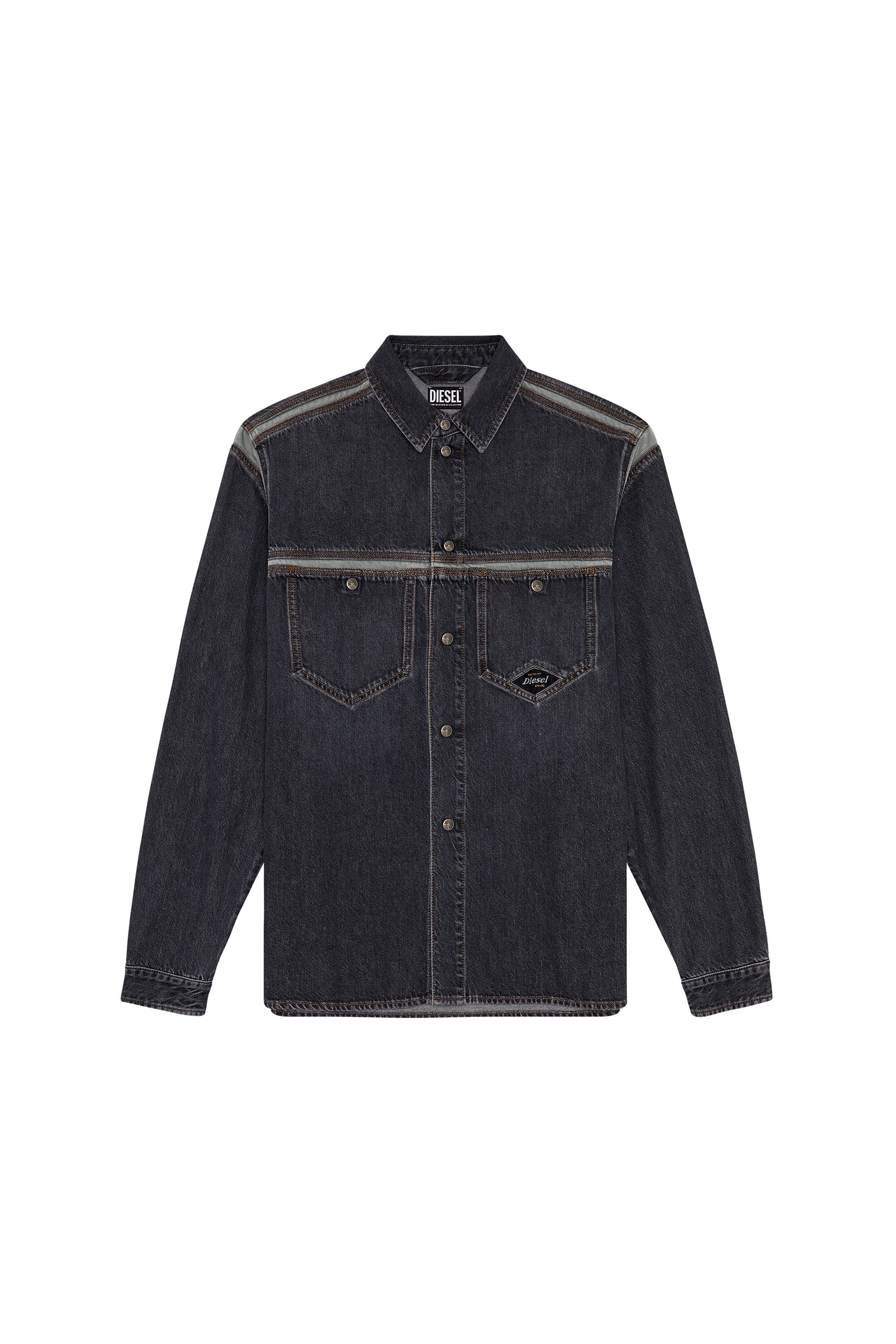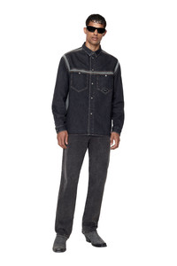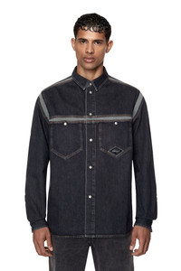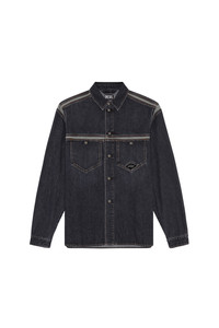 PRODUCT ID: A05619068AJ - 100%Cotton Model is wearing a size L and is 182 cm / 5'10'' Fits true to size, take your normal size. Shirt inspired by archival designs. Featuring a vintage logo insert and metal snaps, it's crafted from panels of dark-grey fix denim, linked together with contrasting green fabric. The final wash confers a natural lived-in look.