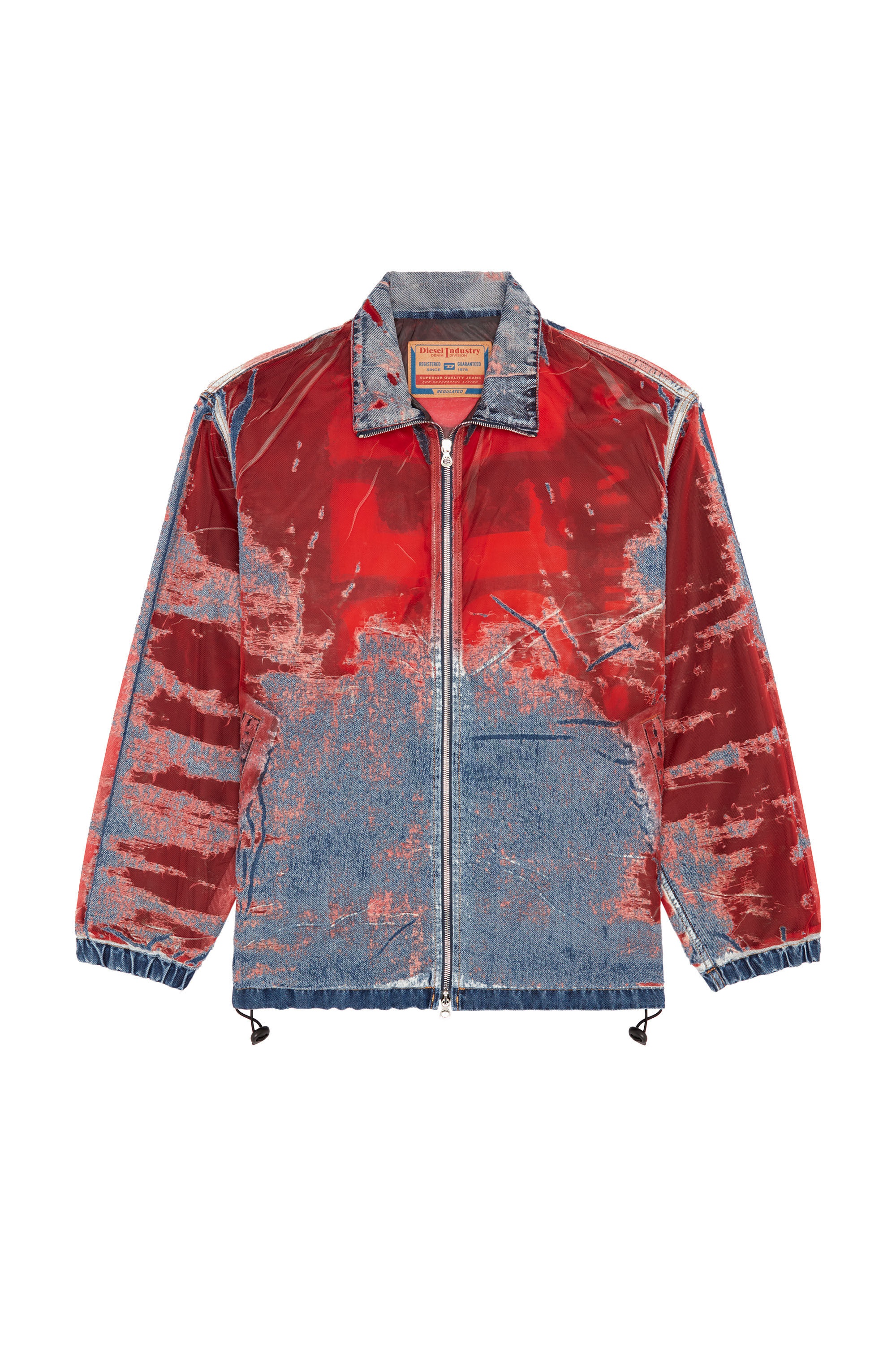Model is wearing a size L and is 182 cm / 5'10'' Fits true to size, take your normal size. Designed for the SS24 Runway Show, this men's jacket features a relaxed silhouette, tempered by elasticated cuffs and hem. Crafted from medium blue fix denim, this dévoré wash combines a signature Diesel craftsmanship with the iconic brand logo. The denim is treated with all-over corrosions that lend the garment a transparent finish, revealing the inner fabric constructions and bold red Diesel lettering, printed on the inside to enhance the scorched, ultimately distressed look.