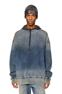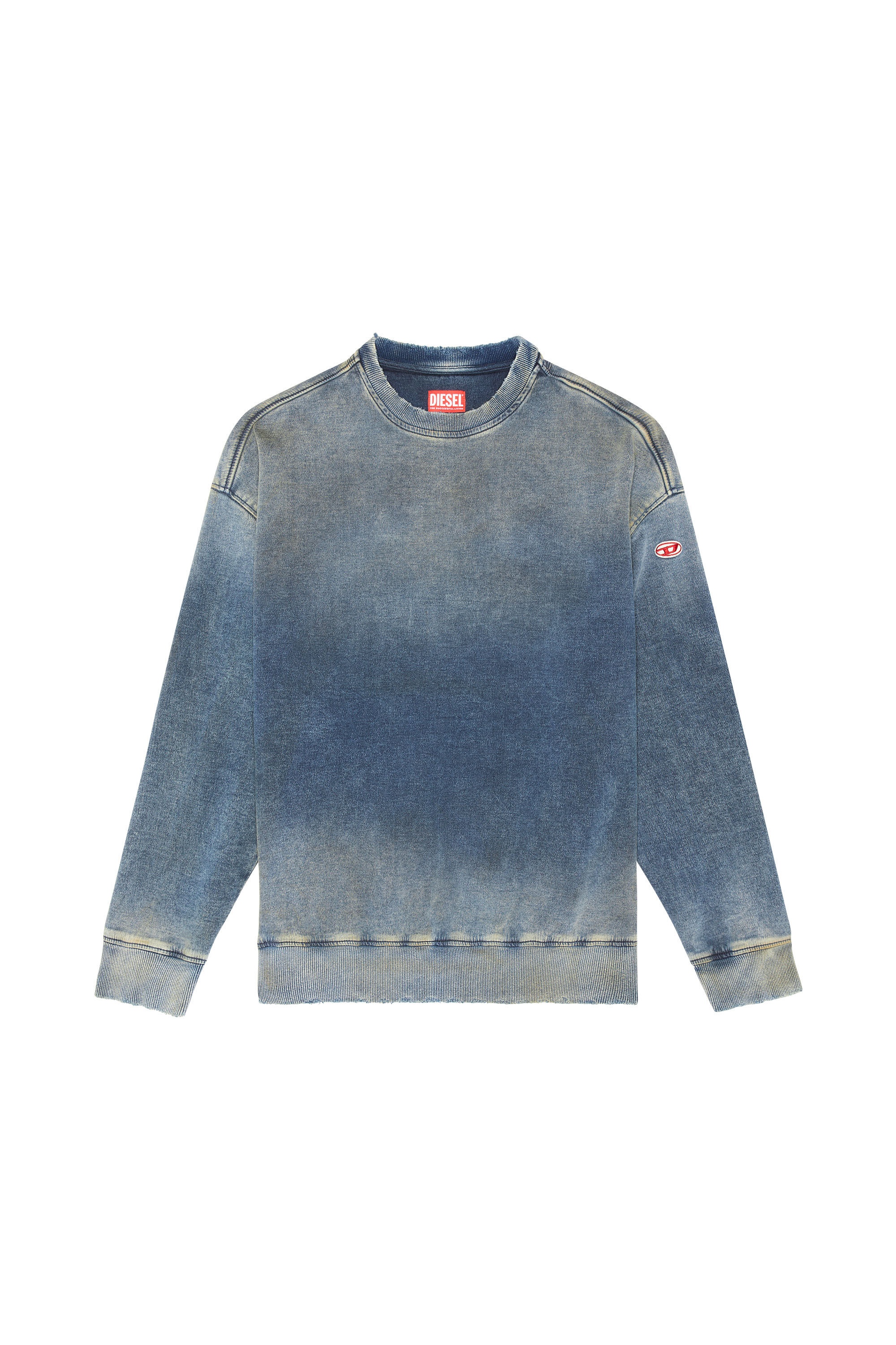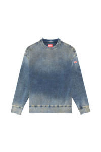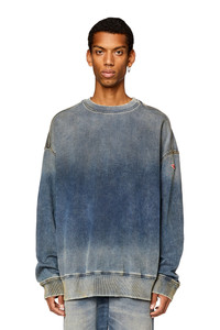 Model is wearing a size L and is 182 cm / 5'10'' Fits true to size, take your normal size. Men's loose-fit sweatshirt crafted from Track Denim for the utmost comfort. The dark blue wash channels a vintage look and feel, with visible whiskering and dirt-effect shading.