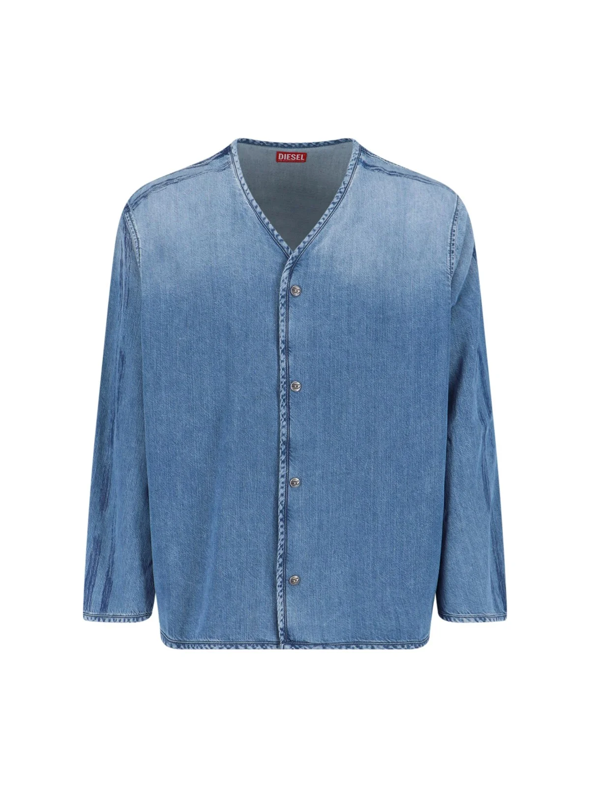 DIESEL 'D-NABIL-S3' SHIRT IN BLUE LYOCELL AND COTTON DENIM WITH V-NECK, FRONT BUTTON CLOSURE, LONG SLEEVES, BACK PRINT, STRAIGHT HEM. PRODUCT INFO PRODUCT CODE A21738 0CECC01 COMPOSITION: 60% LYOCELL, 40% COTTON SIZE AND FIT: REGULAR FIT MADE IN: ROMANIA