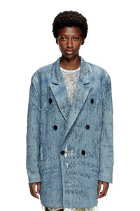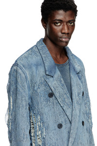 Product Description An alternative fusion of soft tailoring and contemporary craftsmanship, this men’s blazer features a relaxed double-breasted silhouette. Crafted using a percentage of organic cotton, this ultra-distressed wash is the perfect example of finding beauty in what is destroyed – a key theme of the Spring Summer 2025 Runway Show. The jacquard fabric is woven on a double loom, creating a particular warp and weft construction that reverses the look of traditional denim: long indigo threads stand out on the front, while the white threads remain on the inside. This unexpected contrast adds depth and dynamism to the style. ID: A19364068RQ Size & Fit Model is wearing a size L and is 188 cm / 6'2". Model is wearing a size S and is 177 cm / 5'9". Check the size chart to choose the correct size. Materials & Details Composition: 89%Cotton 10%Polyester 1%Elastane-Spandex Spring Summer 2025 Runway Show Double-breasted button closure Six buttons, two functional Lined