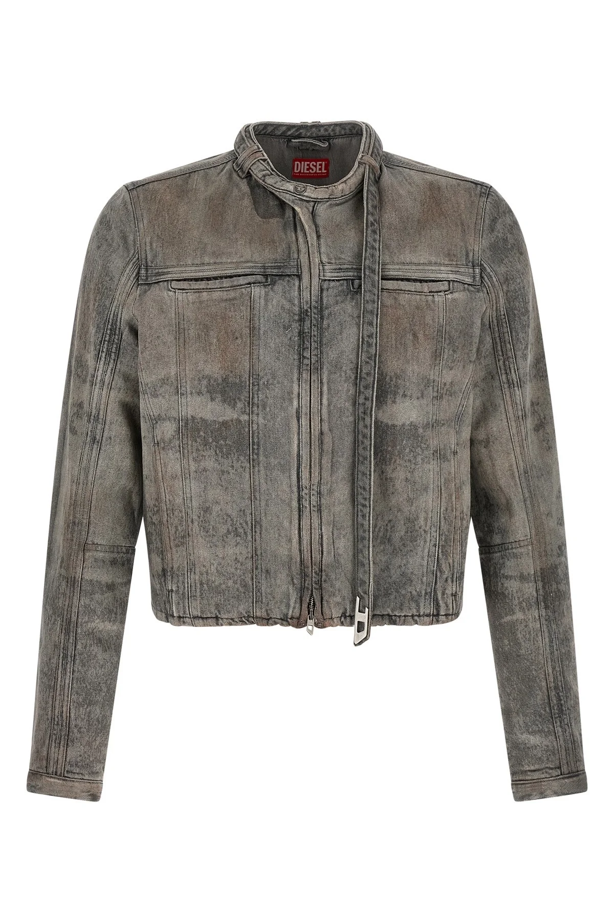 cod. A2349309P2402 D-Vulmar-Fsi' cotton and hemp satin denim jacket with laser-treated metal threads sprayed with a sulfur-based pigment coating, round collar that turns into a long webbing that wraps around the neck, closed with logo button and final detail with metal D, front zip closure, pockets, long cuffed sleeves, Lining. The lived appearance of this garment has been obtained through craftsmanship and innovative treatments, therefore, the non-uniform appearance between garment and garment is to be understood as characteristics of uniqueness. Color: Gray Size & Fit: Slim fit Composition: 80% cotton, 20% hemp Made in: Tunisia