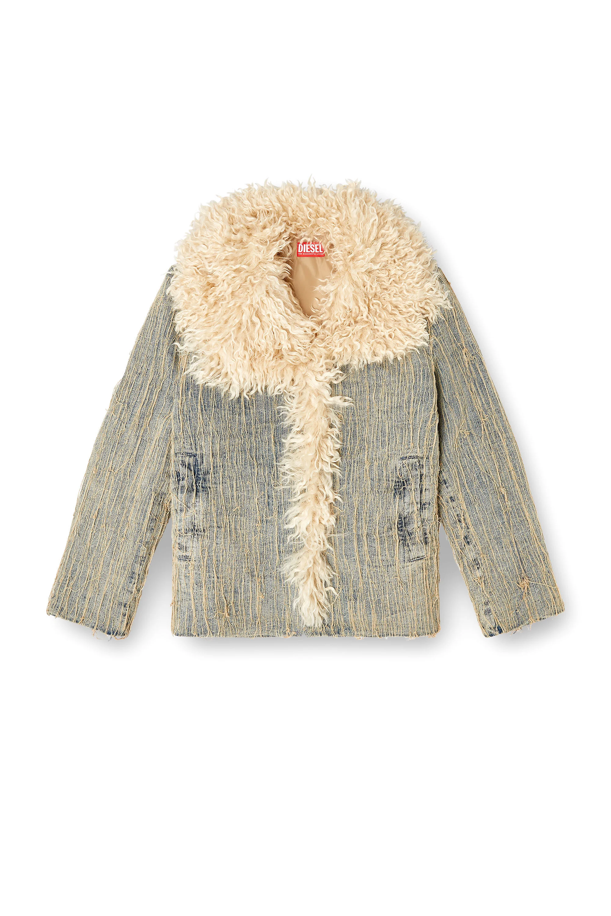Product Description Lightly padded for warmth, this women's jacket is cut to a straight silhouette and detailed with maxi lapels with a soft, curly texture. This jacquard-weave fabric is an example of Diesel's denim know-how, offering a sophisticated take on fix denim. Woven with floating threads, it undergoes a stone wash that creates a striking marble effect. A second wash dyes the threads in a beige tone, adding depth and contrast to the design. The result is a refined yet rugged look, where intentional distressing meets artisanal technique. ID: A190450CMBZ Size & Fit Model is wearing a size S and is 175 cm / 5'7'' Check the size chart to choose the correct size. Materials & Details Composition: 95%Cotton 5%Polyester, Application 100%Polyester Hidden snap button closure Side pockets Lined and padded
