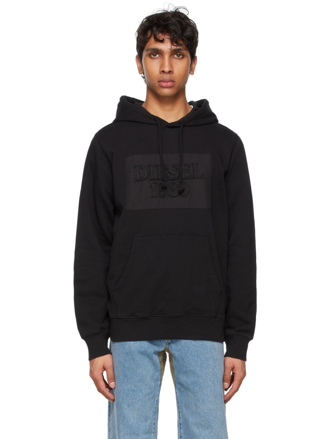 Long sleeve French terry hoodie in black. Drawstring at hood. Tonal cotton canvas patch and logo appliqués at front. Kangaroo pocket at waist. Rib knit cuffs and hem. Part of the DieselXDiesel capsule collection. Supplier color: Black 100% cotton.
