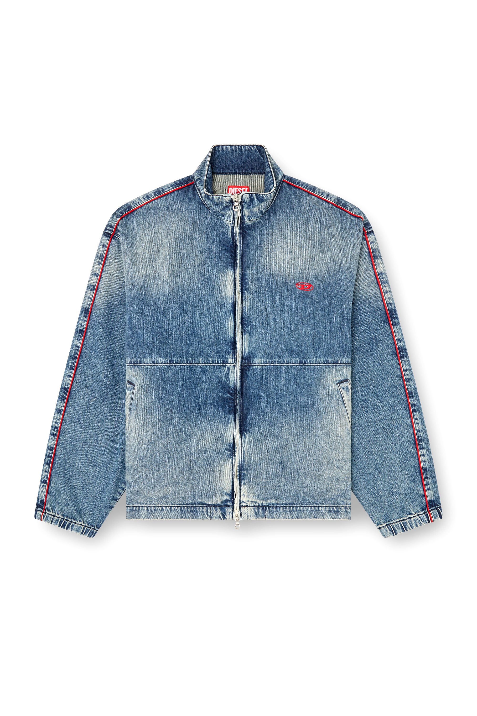 Product Description This men's jacket features a relaxed silhouette with dropped shoulders, tempered by elasticated cuffs and hem. Detailed with piping and logo embroidery in iconic Diesel red, this medium blue wash channels a dynamic, sporty look. It's crafted from fix denim that's treated to impart a distinctive worn look. ID: A163420ABCP Size & Fit Model is wearing a size L and is 182 cm / 5'10'' Check the size chart to choose the correct size. Materials & Details Composition: 100%Cotton High neckline Zip closure Unlined