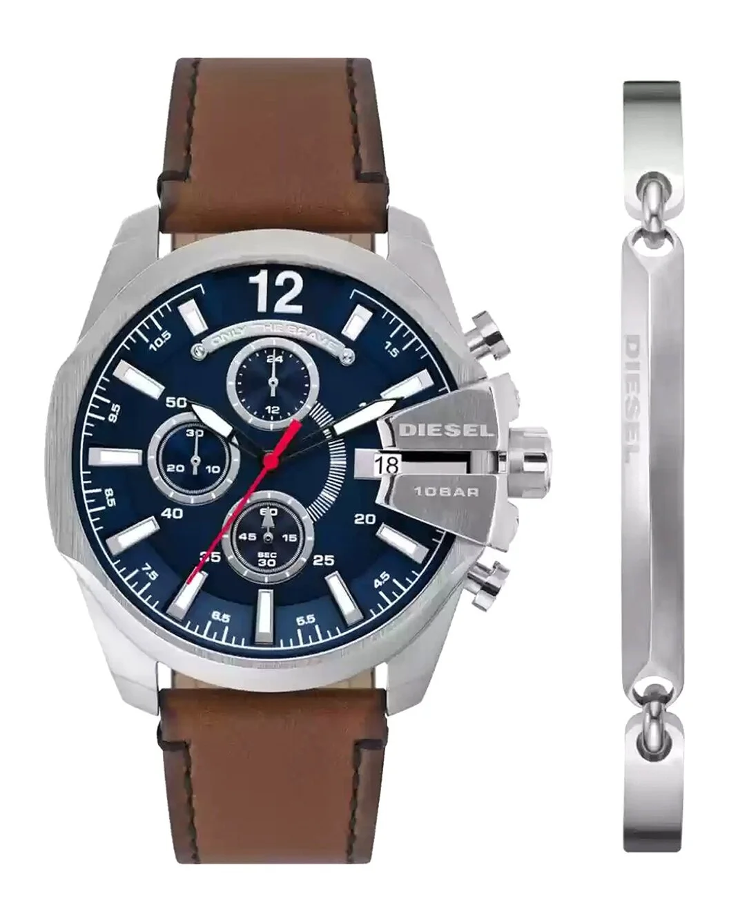- Quartz movement - Brown Leather strap - Buckle clasp - Stainless Steel bezel - Stainless Steel case - Mineral crystal - Push/pull crown - Blue dial - Case: 43mm x 10mm - Bracelet/strap: 22mm wide x 7.5in long - Water-resistant up to 10 ATM - 100 meters - 330 feet meters - 1-year limited third party warranty - The Watch Size Guide