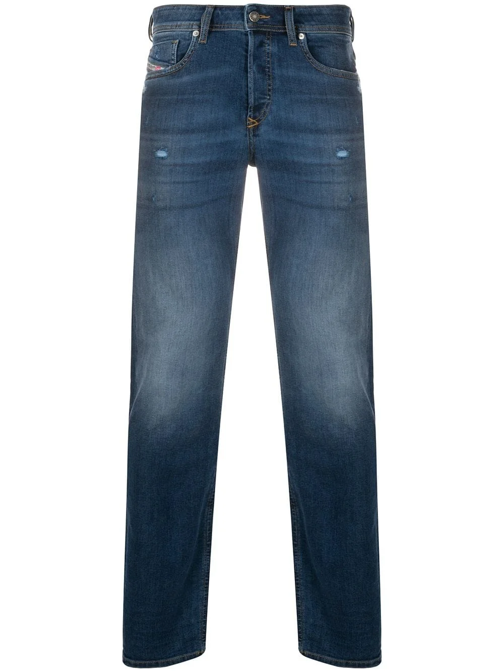 distressed slim-fit jeans Highlights - Indigo blue - Cotton-blend - Logo patch to the rear - Distressed effect - Belt loops - Front button and zip fastening - Classic five pockets - Stretch fit Imported Composition Cotton 85%, Polyester 13%, Spandex/Elastane 2% Washing instructions Machine Wash