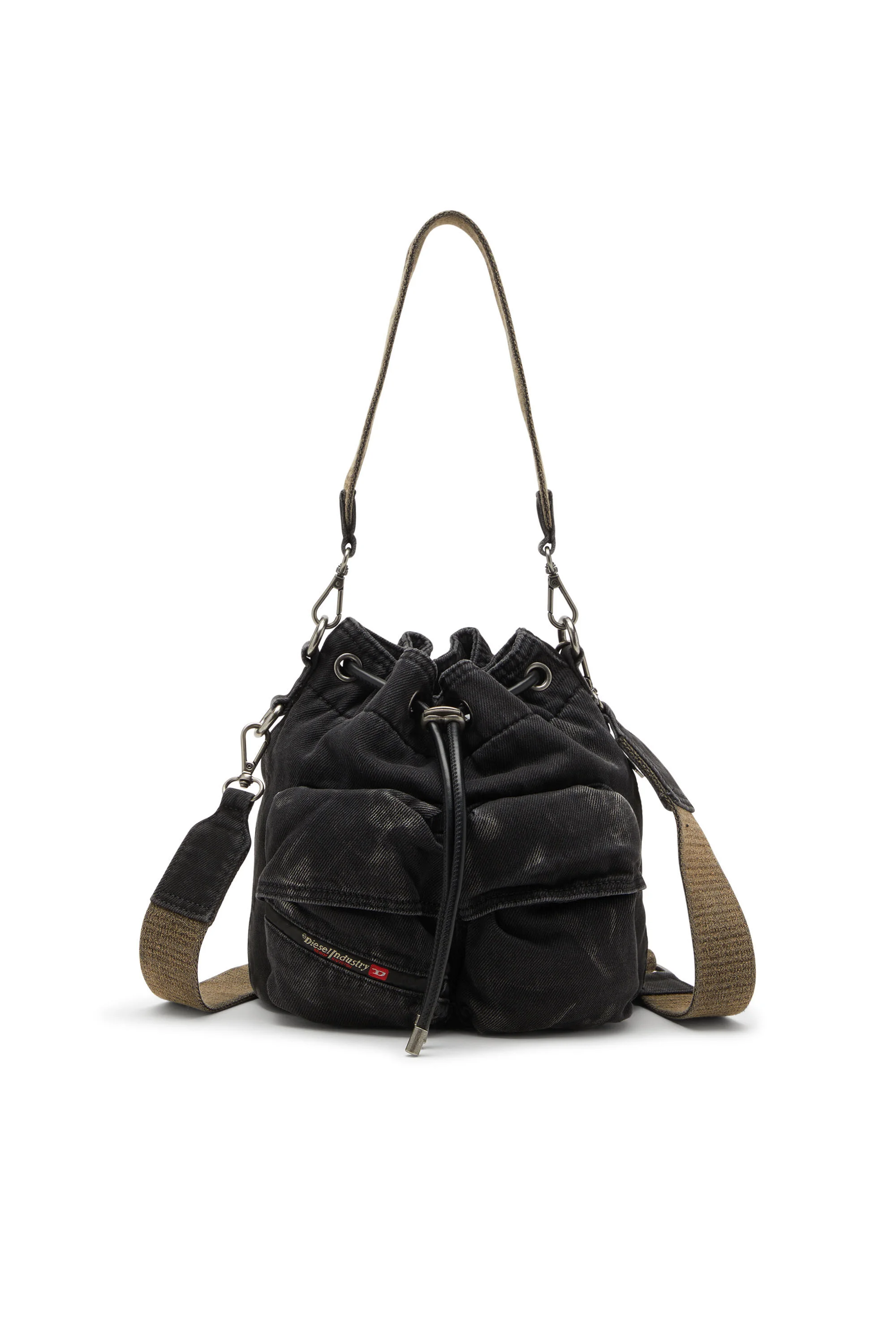 Product Description This unisex bucket bag is the ultimate utilitarian organiser. Crafted from Diesel's DNA fabric – denim – in a faded black wash, it’s kitted with easy-access flap pockets on the front, a zip pocket on the side and a convenient drawstring closure. The handle and shoulder strap can be detached, providing versatile carry options. Complete with the signature Diesel Industry flag. ID: X10375P4485 Materials & Details Composition: 95%Cotton 5%Polyurethane Handle and adjustable shoulder strap are both detachable Drawstring closure2 front flap pockets, 1 side zip pocket and 1 internal zip pocketLogo jacquard liningUnisex