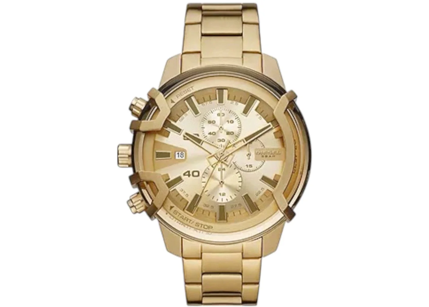 - Reference Number DZ4573 - Case Size 48mm - Case Material Stainless Steel - Band Stainless Steel - Movement Quartz - Dial Gold - Retail Price 350 - Base Model Griffed Chronograph - Featured false - Requester Nathan P - Styles Casual - Uploaded By VL