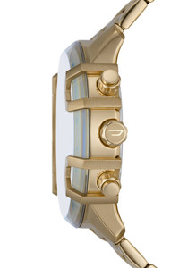 Product Description WARRANTYDiesel's 48mm Griffed watch features a gold novelty, sunray dial, chronograph movement and gold-tone stainless steel bracelet. ID: DZ459500QQQ Materials & Details Composition: Steel Case Size: 48x55 Case Thickness: 13MM Water Resistance: 5 ATM Case Material: STAINLESS STEEL Case Finish: COMBO Attachment Material: STAINLESS STEEL Attachment Color: Gold Closure/Adjustability: 2 Pusher Foldover Clasp Dial Color: Gold Movement: Quartz/Chrono