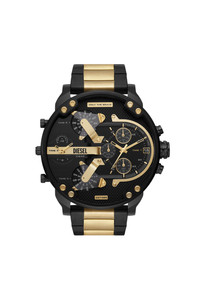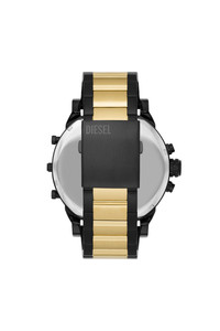 PRODUCT ID: DZ746500QQQ - Steel - Case Size: 57x67 - Case Thickness: 14MM - Water Resistance: 3 ATM - Case Material: STAINLESS STEEL - Case Finish: COMBO - Attachment Material: Stainless Steel - Attachment Color: Black - Closure/Adjustability: Bracelet Deployant - Dial Color: Black - Movement: Quartz/3 Hand WARRANTY Diesel's 57mm Mr. Daddy 2.0 watch features a black textured sunray dial, chronograph/multi-movement and two-tone stainless steel bracelet.