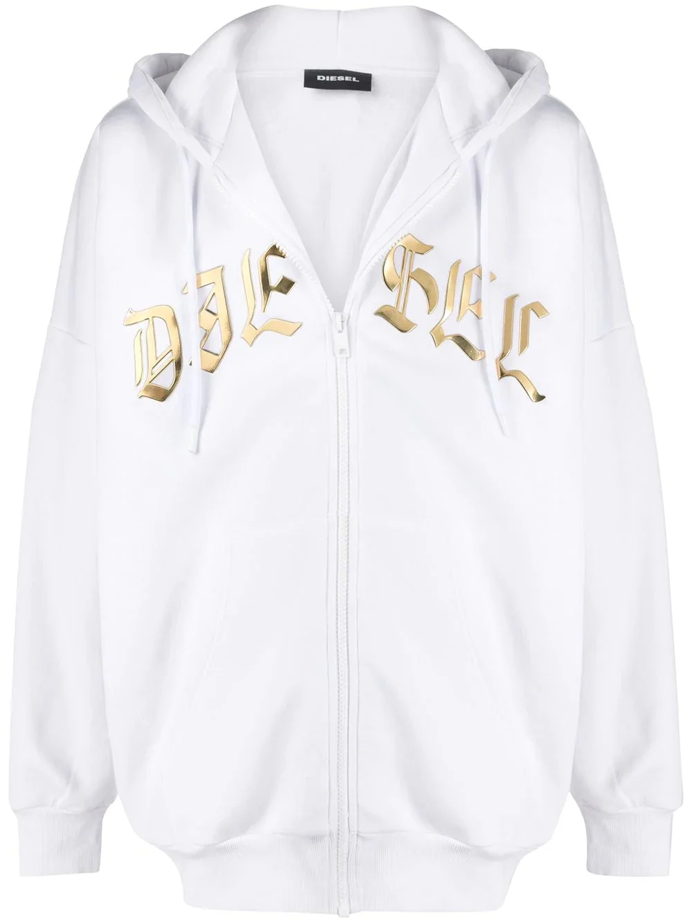 foil logo zip-up hoodie white/gold-tone cotton-blend slouchy drawstring hood front zip fastening gold-tone logo lettering drop shoulder long sleeves two side pouch pockets ribbed edge Imported Composition Cotton 70%, Polyester 30% SIZE & FIT Model measurements Height 6 ft 2 in(1.89 m) Bust/Chest 37.79 in(96 cm) Hips 37 in(94 cm) Waist 29.92 in(76 cm) FittingInformation This piece fits true to size. We recommend you get your regular size Cut for an oversized fit Made with a mid-weight fabric Washing instructions Hand Wash