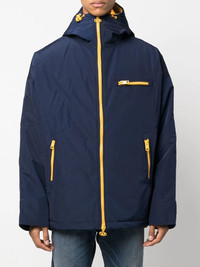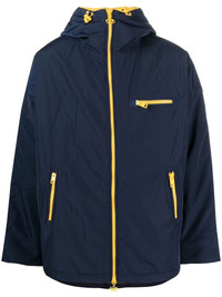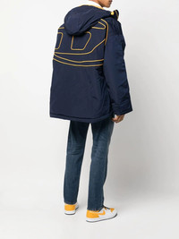 hooded logo-print jacket navy blue/yellow logo print to the rear classic hood front zip fastening front zip fastening pockets long sleeves rear curved hem Imported Composition Lining: Nylon 100%, Polyester 100% Outer: Polyester 100%, Polyurethane 100% SIZE & FIT Model measurements Height 6 ft 2 in(1.87 m) Bust/Chest 38.18 in(97 cm) Hips 36.61 in(93 cm) Waist 29.13 in(74 cm) FittingInformation This piece fits true to size. We recommend you get your regular size Cut for a loose fit Made with a mid-weight non-stretch fabric Washing instructions Machine Wash