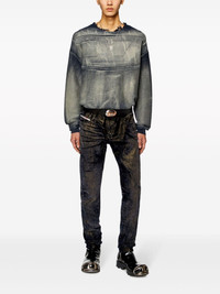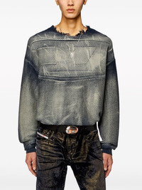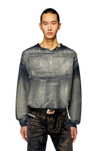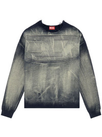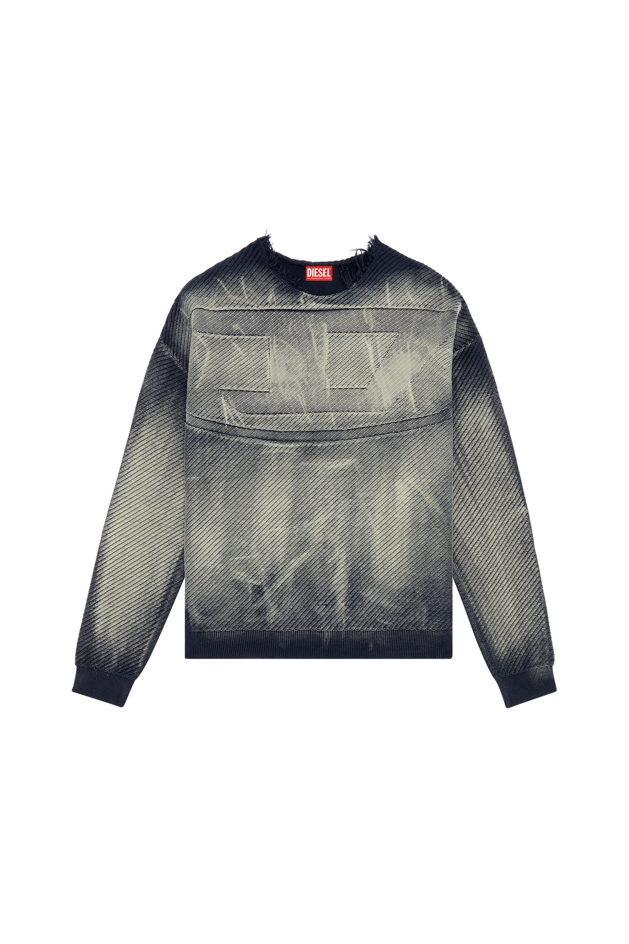 Model is wearing a size L and is 182 cm / 5'10'' Fits true to size, take your normal size. Translating distressed denim into knitwear, this men’s cotton sweater is knitted with a pronounced diagonal texture, frayed at the neck, and treated to create a streaky faded blue hue. The loose silhouette provides the ideal canvas for the oversized jacquard Oval D logo. By buying cotton products from Diesel, you’re supporting responsible cotton production through Better Cotton”.