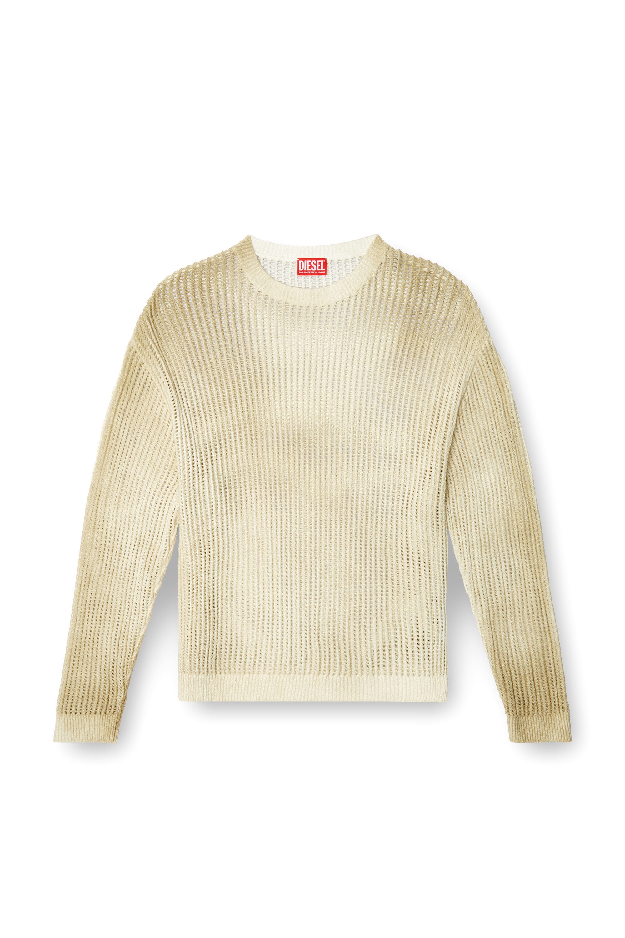 Product Description This men’s sweater is pointelle-knitted from a blend rich in organic cotton and features a relaxed fit. The chunky mesh-like construction is see-through and airy, laced with distressed undertones via the spray-painted bursts of a darker colour. ID: A178680AKBN Size & Fit Model is wearing a size L and is 182 cm / 5'10'' Check the size chart to choose the correct size. Materials & Details Composition: 64%Cotton 36%Polyamide-Nylon Relaxed fit