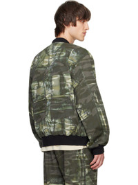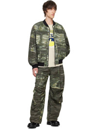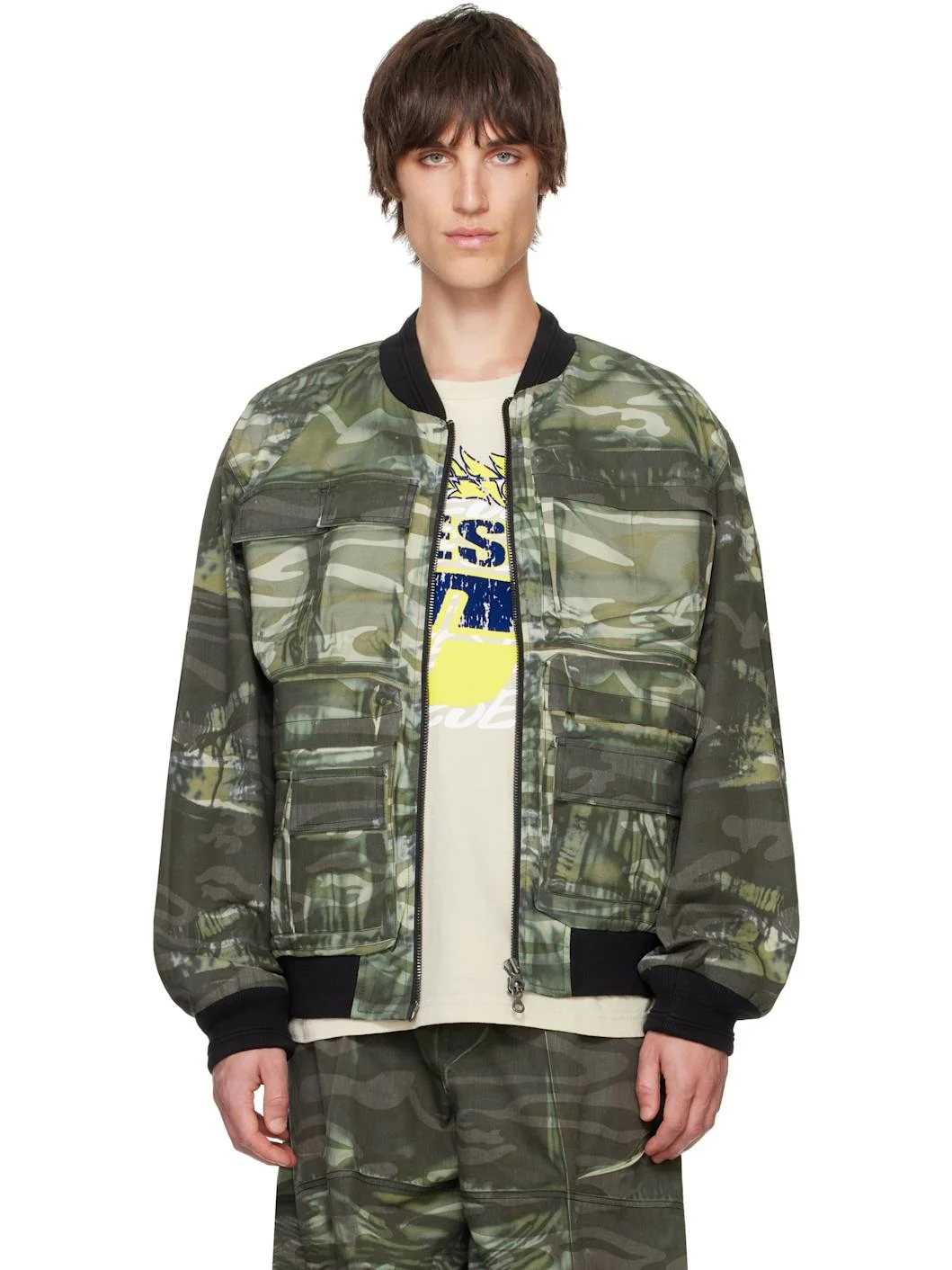Polyester- and cotton-blend twill bomber jacket. Bleached effect and camouflage pattern printed throughout. · Rib-knit stand collar, hem, and cuffs · Two-way zip closure · Flap and welt pockets · Dropped shoulders · Logo embroidered at sleeve · Patch pocket at interior · Fully lined Supplier color: Green Body: 65% polyester, 35% cotton. Trim: 97% cotton, 3% elastane. Lining 1: 100% cotton. Lining 2: 100% polyester. Made in India 242001M175000