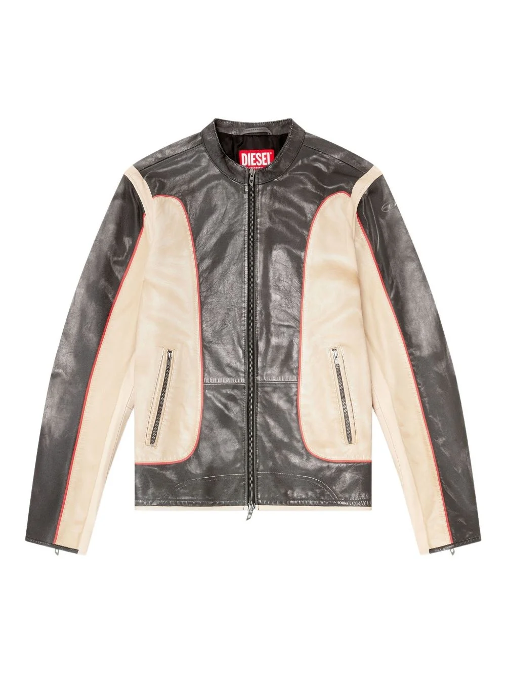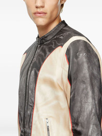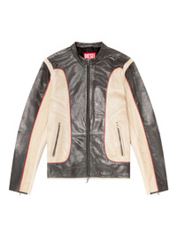 L-Evert leather biker jacket Highlights - Black and beige - Leather - Colour-blocked panels - Zip fastening - Red stitching - Welt pockets - Debossed logo Made in Italy Composition Ovine Leather (top grain) 100% Washing instructions Specialist Cleaning