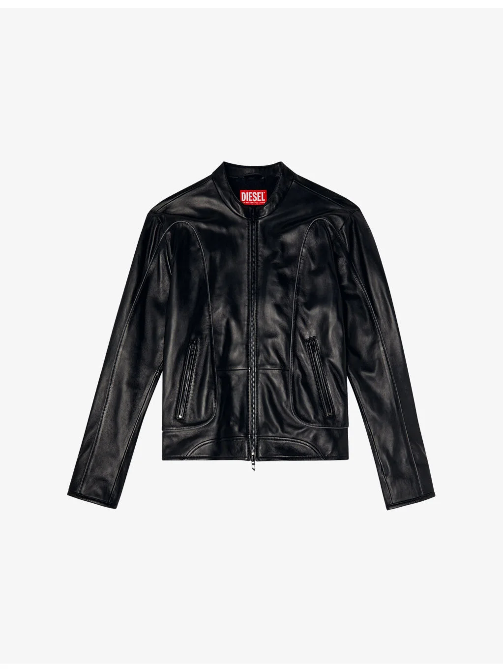 PRODUCT DETAILS - Diesel leather jacket - 100% leather - Exposed zip fastening at front - Regular fit, stand collar, long sleeves, embossed branding at sleeve, zip opening at cuffs, two zipped pockets at front, two-way zip fastening, lined - Specialist leather clean - Midweight, non-stretch Ref: R04410842