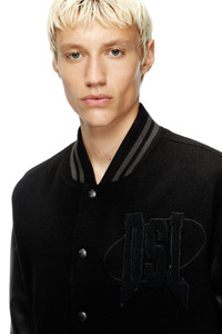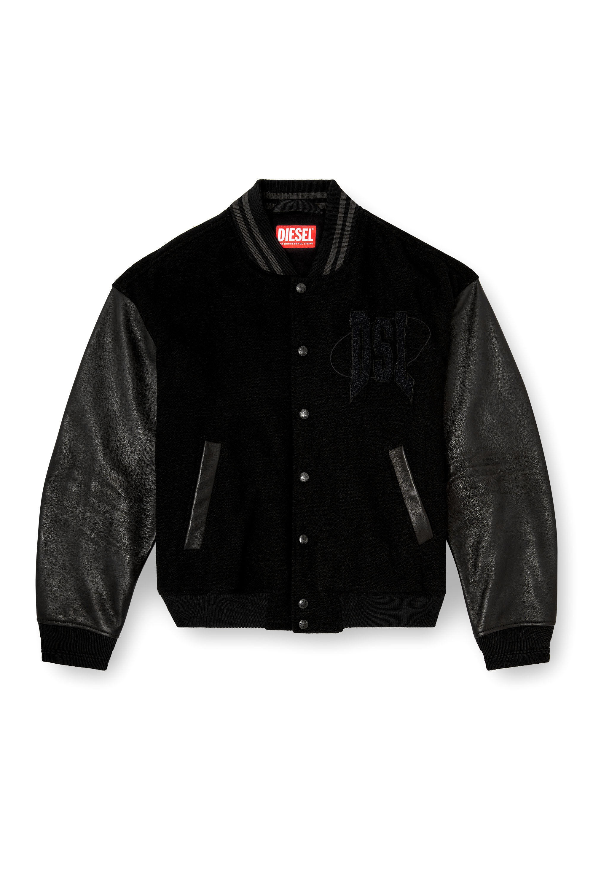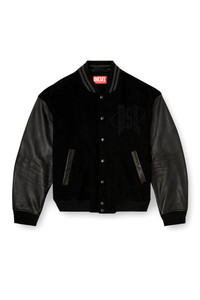 Product Description Men's cotton bomber jacket, featuring leather sleeves and striped ribbed trims. Varsity logo motifs on the chest and back add a tactile note. ID: A144140LHAL Size & Fit Model is wearing an IT size 48 and is 188 cm / 6'2" Check the size chart to choose the correct size. Materials & Details Composition: 81%Wool 19%Polyamide-Nylon, Sleeves 100%Cowhide Leather, Rib 95%Polyester 5%Elastane-Spandex Side pockets Ribbed collar, cuffs and hem Snap button closure Lined