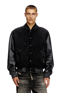 Product Description Men's denim bomber jacket with tonal leather sleeves. Lined for a smooth fit, this piece undergoes a number of processes to achieve its final look, including a hand-sprayed colour treatment, wash cycle and sheeny wax finish for the leather. Bold appliqued logo patches adorn the back. ID: A173660IKAW Size & Fit Model is wearing an IT size 48 and is 188 cm / 6'2" Check the size chart to choose the correct size. Materials & Details Composition: 100%Cotton, Sleeves 100%Sheepskin Leather, Rib 98%Cotton 2%Elastane-Spandex Snap-button pockets and closure Ribbed trims Lined