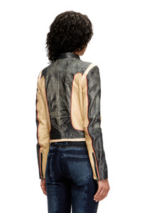 Product Description The biker jacket gets a meta treatment via trompe l’oeil. Crafted from responsibly sourced vegetable-tanned leather, this women's slim-cut style features a hyper-realistic trompe l'oeil print of an archival '90s moto jacket, with its characteristic colour-block design and piping details. It's fitted with concealed side pockets, meaning the zip-fastening ones are merely an illusion. ID: A193820DEBV Size & Fit Model is wearing an IT size 40 and is 175 cm / 5'7'' Check the size chart to choose the correct size. Materials & Details Composition: 100%Ovine Leather Slim fit Hidden side pocketsZipped cuffsTwo-way zip closureLined