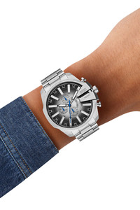 Product Description WARRANTYDiesel's 48mm Mega Chief Slim watch features a black and silver brushed sunray dial, chronograph movement and stainless steel bracelet. ID: DZ468600QQQ Materials & Details Composition: Steel Case Size: 48x55 Case Thickness: 10.0MM Water Resistance: 5 ATM Case Material: stainless steel Case Finish: combo Attachment Material: stainless steel Attachment Color: Gold Closure/Adjustability: Double Press Deployant Buckle Dial Color: Gold,Green,Silver Movement: Quartz/Chrono