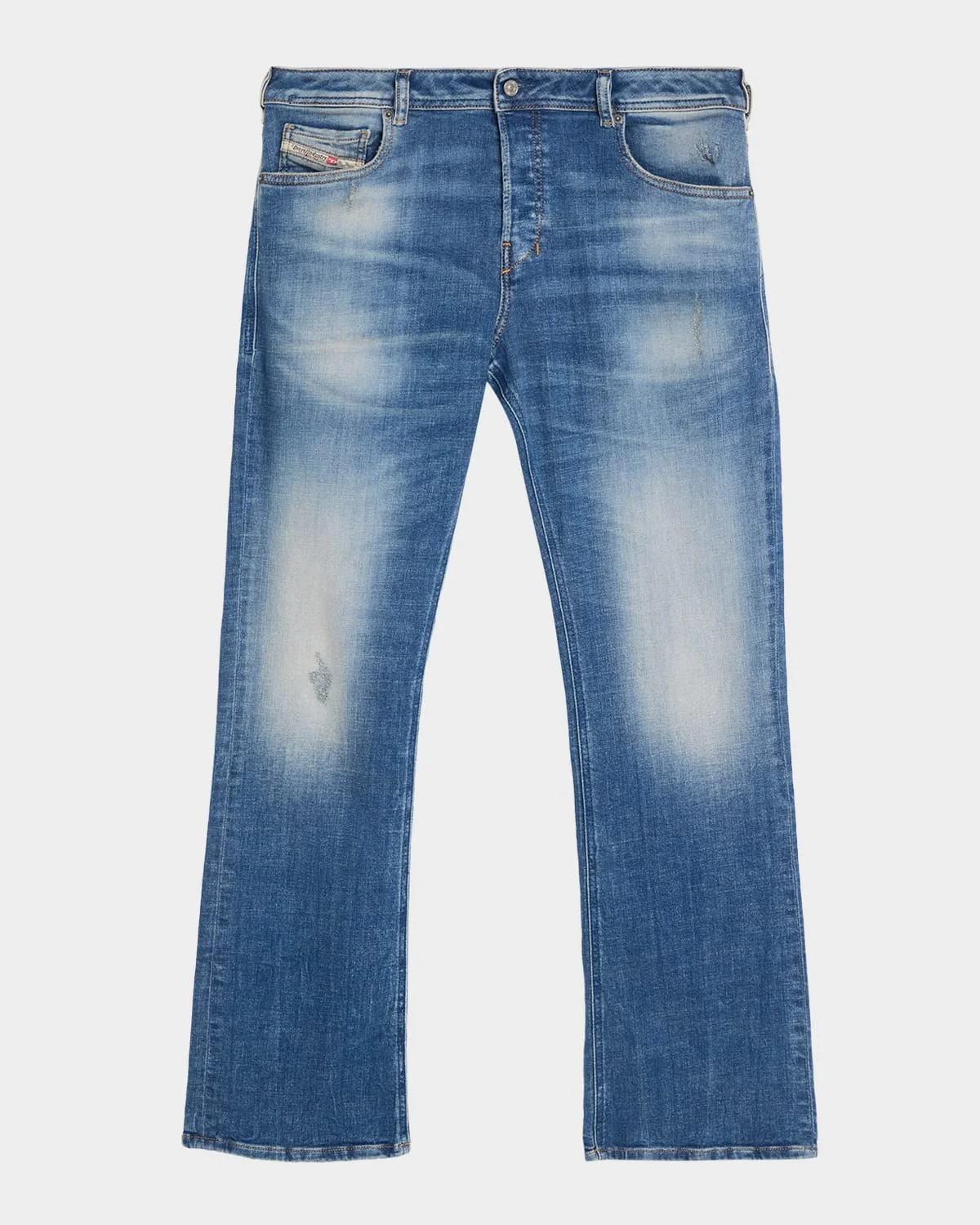 Diesel & apos;s jeans are crafted from comfort denim with recycled cotton, and a & nbsp;medium blue wash characterised by a visually impactful, used look. Enriched with small abrasions and rips that are carefully trimmed and mended Fading throughout Regular rise Five-pocket style Modern fit through slightly flared & nbsp;legs Button-zip front; belt loops Cotton/elastane/spandex Machine wash cold Imported