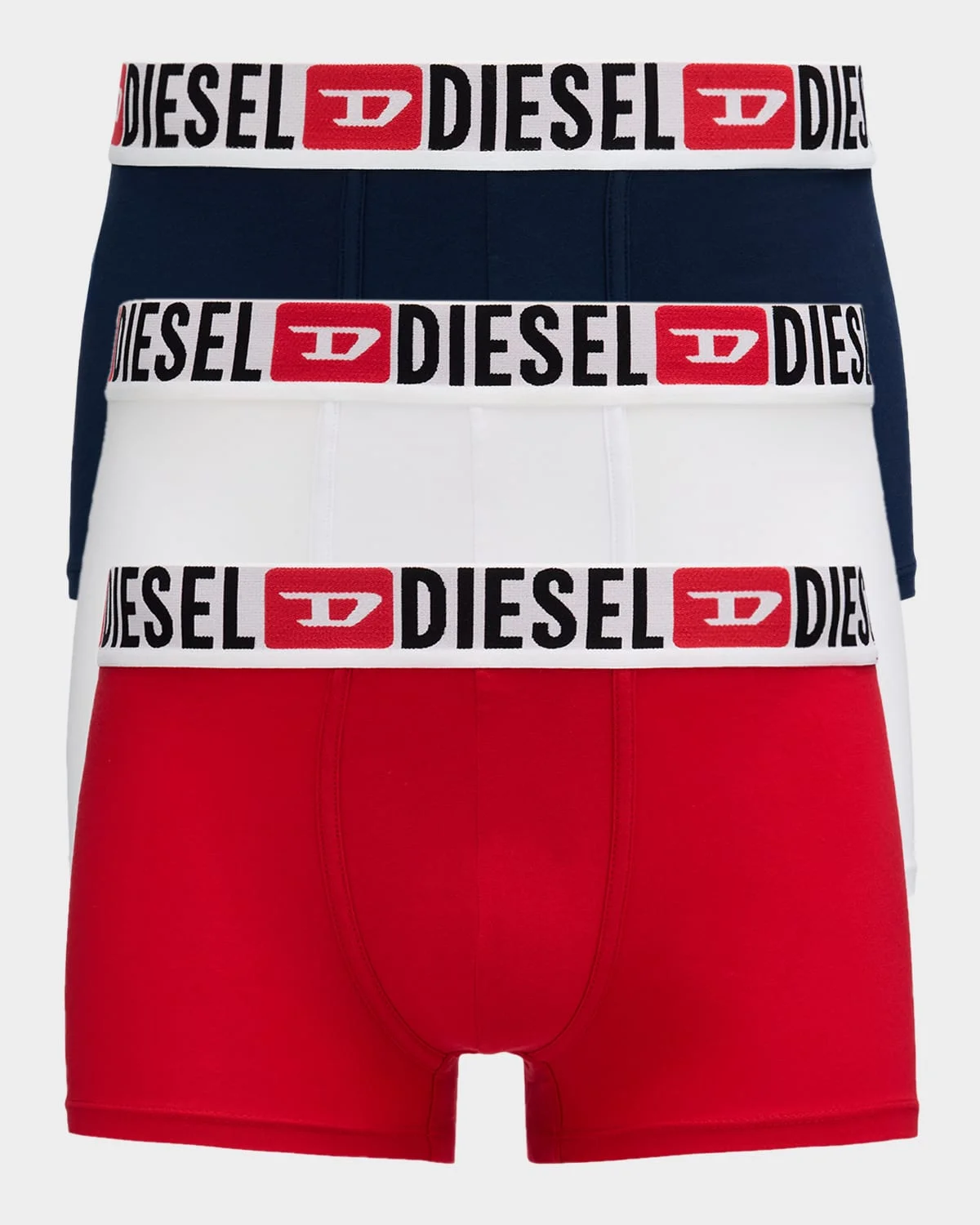 Diesel set of three & nbsp;plain stretch cotton boxer briefs in assorted colors Elasticated jacquard waistband with an allover denim division logo Seamless back for enhanced comfort Cotton/elastane Machine wash cold Imported