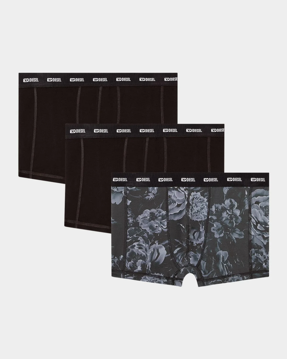 Diesel set of three men's boxer briefs cut from soft and breathable stretch cotton Two solid pairs One floral patterned pair Jacquard logo elasticized waistband Contrast stitching Cotton/elastane Machine wash cold Imported