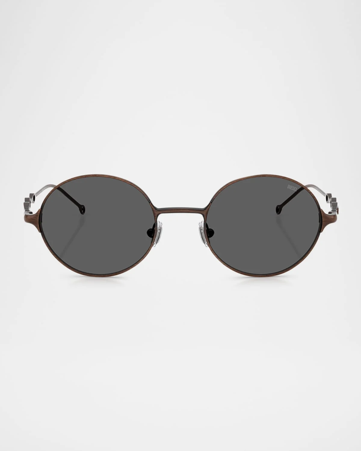 - Avant-garde style meets streetwear-inspired shapes in trini-d-y metal. Unapologetically bold with statement details, this collection of catwalk and commercial frames is all about impactful style. Designed for a fashion-forward look with an individualistic edge. an iconic design with an authentic diesel attitude. The round shape channels a creative spirit, while sleek frames in metallic colors add an industrial edge. Featuring standout temples with three cut-out beads and a custom d logo. A classic look with an alternative vibe. metal frames are available in matte gunmetal, shiny brushed antique light-yellow brown, shiny silver and powder matte black. Colorways for the round lenses include dark grey, grey, mirror silver or light to dark gradient green. Dl1008 features a shiny brush light yellow color on a round frame with grey lenses. each pair of sunglasses come with a cleaning cloth and case to clean and protect your sunglasses from scratches and damage. To protect your eyes from harmful uv rays, these sunglasses include lenses that are coated with 100% uv protection. - Diesel round sunglasses in metal - Lens/bridge/temple (in mm): - 49-20-145 - Solid-color lenses - Logo on the left lens - Adjustable nose pads - Logo on the temples - Thin arms with cutouts - Metal - Spot clean - 100% UVA/UVB protection - Made in Italy - Proposition 65 warning for California residents