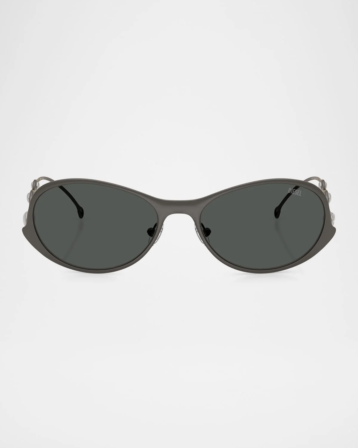 - Avant-garde style meets streetwear-inspired shapes in trini-d-y metal. Unapologetically bold with statement details, this collection of catwalk and commercial frames is all about impactful style. Designed for a fashion-forward look with an individualistic edge. a slick wrapped design with flowing shapes and a futuristic feel. Firmly on-trend, this metal style was seen at the latest diesel catwalk shows. It features an oval-shaped front and a unique temple design with metal beads and the iconic d logo. A powerful look with a badass vibe. metal frames are available in matte gunmetal, powder matte black, shiny brushed antique blue or shiny silver. Bold lenses have an ergonomic, slightly wrapped shape. Colorways include dark grey, dark green, gradient blue or mirror silver. Dl1014 features a matte gun metal color on a oval frame with dark grey lenses. each pair of sunglasses come with a cleaning cloth and case to clean and protect your sunglasses from scratches and damage. To protect your eyes from harmful uv rays, these sunglasses include lenses that are coated with 100% uv protection. - Diesel oval sunglasses in metal - Lens/bridge/temple (in mm): - 56-17-130 - Solid-color lenses - Logo on the left lens - Adjustable nose pads - Logo on the temples - Thin arms - Metal - Spot clean - 100% UVA/UVB protection - Made in Italy - Proposition 65 warning for California residents