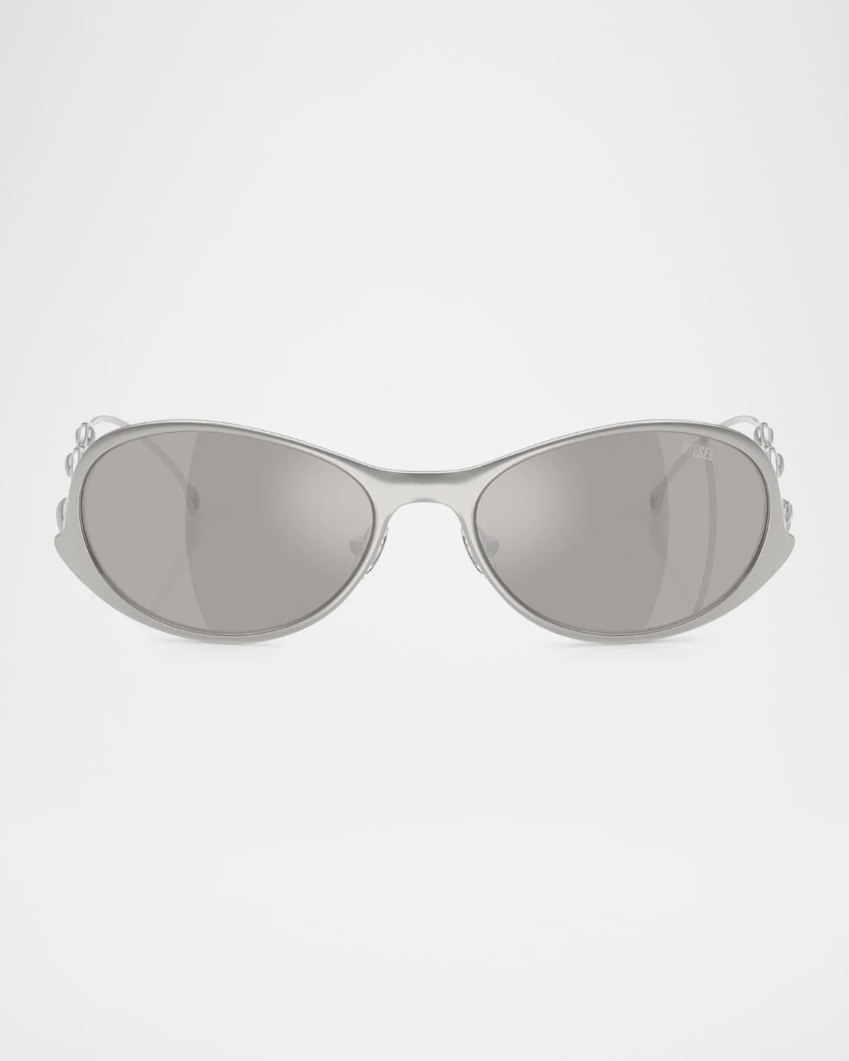 - Avant-garde style meets streetwear-inspired shapes in trini-d-y metal. Unapologetically bold with statement details, this collection of catwalk and commercial frames is all about impactful style. Designed for a fashion-forward look with an individualistic edge. a slick wrapped design with flowing shapes and a futuristic feel. Firmly on-trend, this metal style was seen at the latest diesel catwalk shows. It features an oval-shaped front and a unique temple design with metal beads and the iconic d logo. A powerful look with a badass vibe. metal frames are available in matte gunmetal, powder matte black, shiny brushed antique blue or shiny silver. Bold lenses have an ergonomic, slightly wrapped shape. Colorways include dark grey, dark green, gradient blue or mirror silver. Dl1014 features a shiny silver color on a oval frame with mirror silver lenses. each pair of sunglasses come with a cleaning cloth and case to clean and protect your sunglasses from scratches and damage. To protect your eyes from harmful uv rays, these sunglasses include lenses that are coated with 100% uv protection. - Diesel oval sunglasses in metal - Lens/bridge/temple (in mm): - 56-17-130 - Mirror lenses - Logo on the left lens - Saddle nose bridge - Adjustable nose pads - Logo on the temples - Thin arms - Metal - Spot clean - 100% UVA/UVB protection - Made in Italy - Proposition 65 warning for California residents