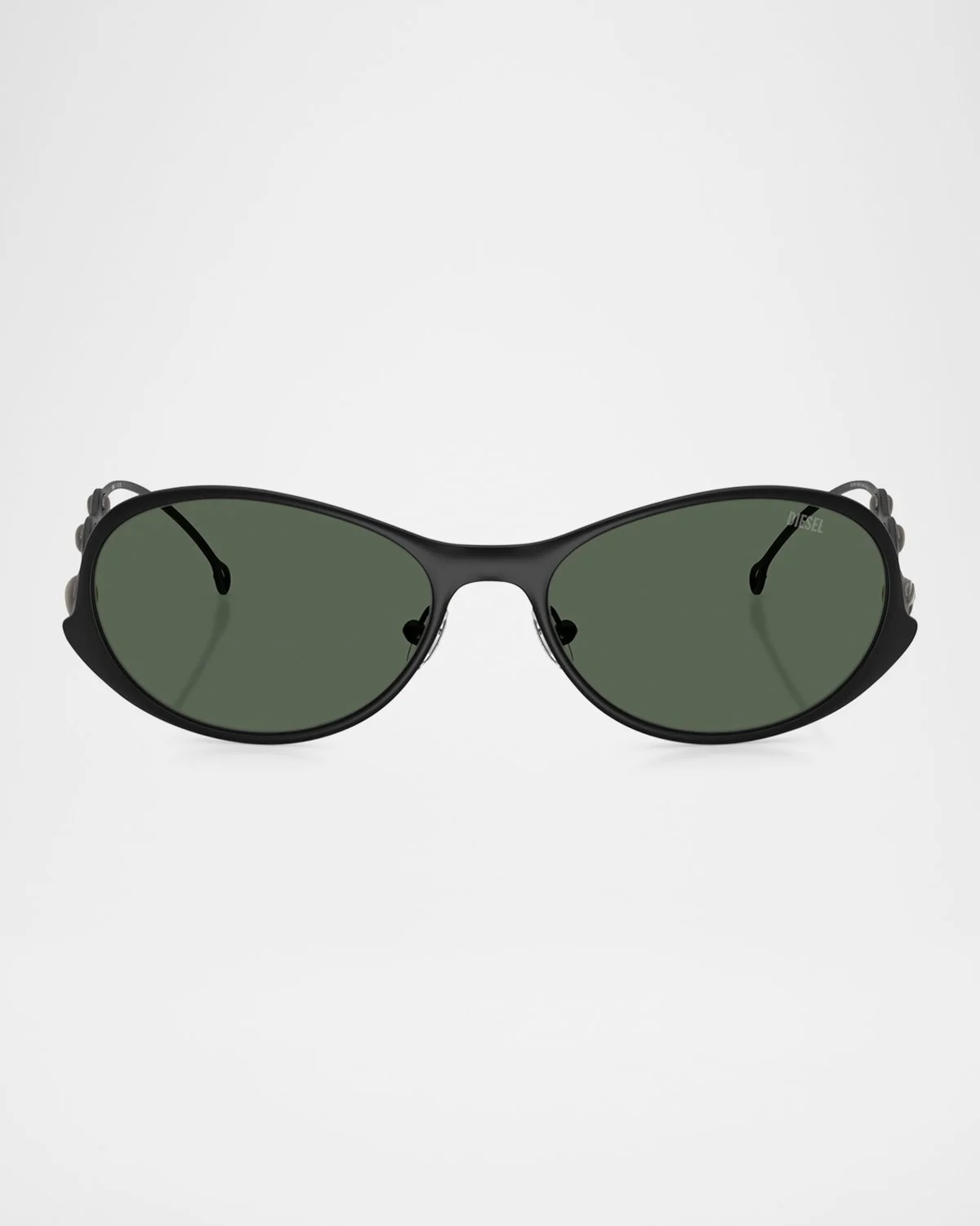 - Avant-garde style meets streetwear-inspired shapes in trini-d-y metal. Unapologetically bold with statement details, this collection of catwalk and commercial frames is all about impactful style. Designed for a fashion-forward look with an individualistic edge. a slick wrapped design with flowing shapes and a futuristic feel. Firmly on-trend, this metal style was seen at the latest diesel catwalk shows. It features an oval-shaped front and a unique temple design with metal beads and the iconic d logo. A powerful look with a badass vibe. metal frames are available in matte gunmetal, powder matte black, shiny brushed antique blue or shiny silver. Bold lenses have an ergonomic, slightly wrapped shape. Colorways include dark grey, dark green, gradient blue or mirror silver. Dl1014 features a powdre matte black color on a oval frame with dark green lenses. each pair of sunglasses come with a cleaning cloth and case to clean and protect your sunglasses from scratches and damage. To protect your eyes from harmful uv rays, these sunglasses include lenses that are coated with 100% uv protection. - Diesel oval sunglasses in metal - Lens/bridge/temple (in mm): - 56-17-130 - Solid-color lenses - Logo on the left lens - Saddle nose bridge - Adjustable nose pads - Logo on the temples - Thin arms - Metal - Spot clean - 100% UVA/UVB protection - Made in Italy - Proposition 65 warning for California residents
