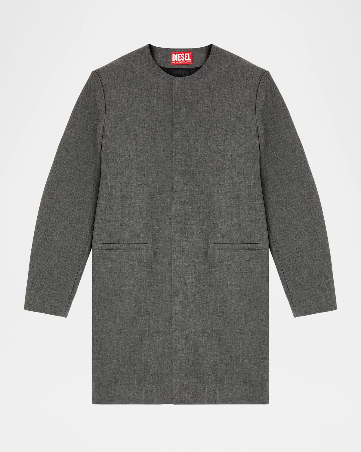 An exclusive runway show style, this Diesel neoprenebonded coat is the definition of precise tailoring with its sharp, minimal silhouette Collarless; hidden snap front Long sleeves Front welt pockets Straight, longline cut Hem hits just above the knee Single back vent Polyester/Proviscose® rayon/elastane Hand wash Made in Italy