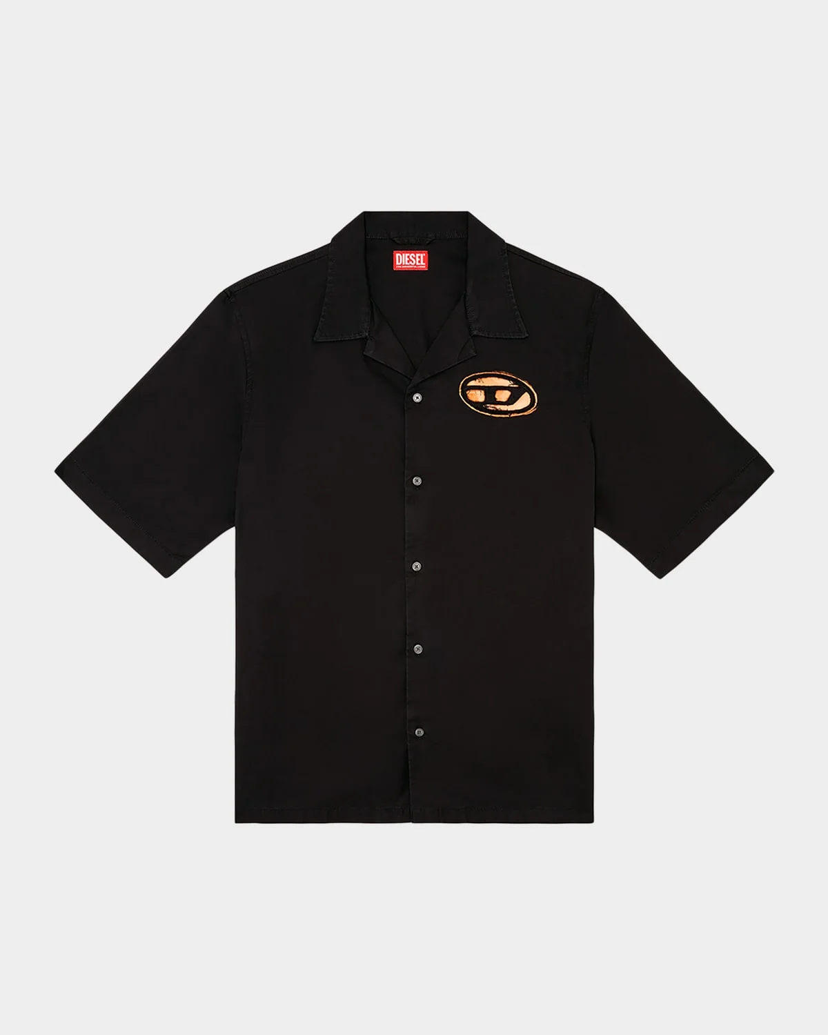 The bowling shirt from Diesel is cut from organic cotton twill with a frayed Oval D logo applique against a bleached backdrop. Camp collar Button front Short sleeves Relaxed fit Cotton Machine wash cold, line dry Imported