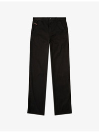 PRODUCT DETAILS - Diesel cotton-twill trousers - 100% cotton - Exposed button and concealed zip-fly fastening at front - Regular fit, mid rise, belt loops, five pockets, brand patch at coin pocket, straight leg, treated finish - Machine wash at 30°C - Model is 6ft 2in/1.88m and wears a size UK 38 - Midweight, non-stretch Ref: R04479690