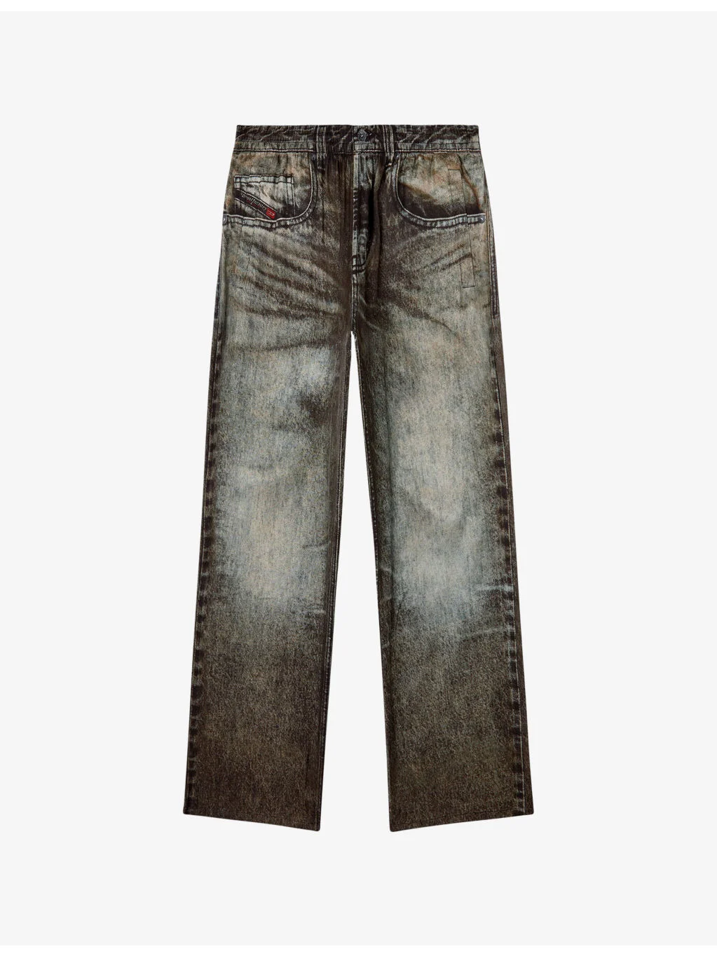 PRODUCT DETAILS - Diesel woven trousers - 100% viscose - Regular fit, mid rise, elasticated waistband, all-over washed denim print, straight leg, two side pockets, back pockets - Hand wash - Model is 6ft/1.83m and wears a size large - Lightweight, non-stretch Ref: R04479618